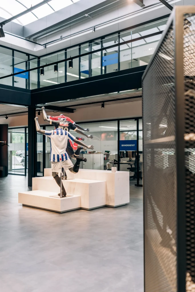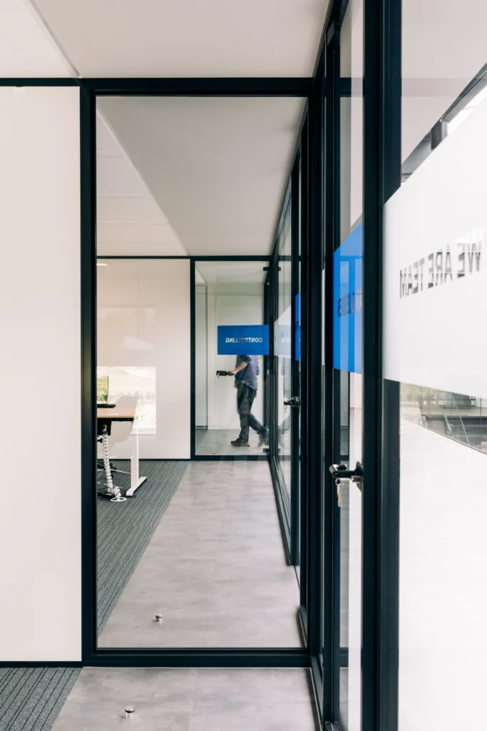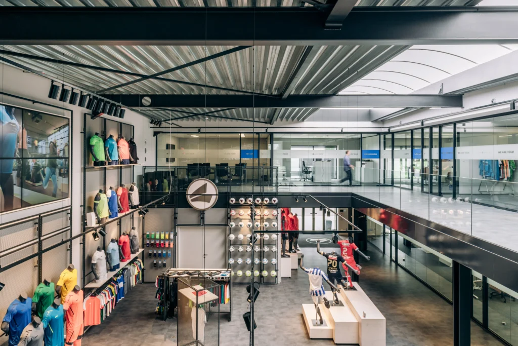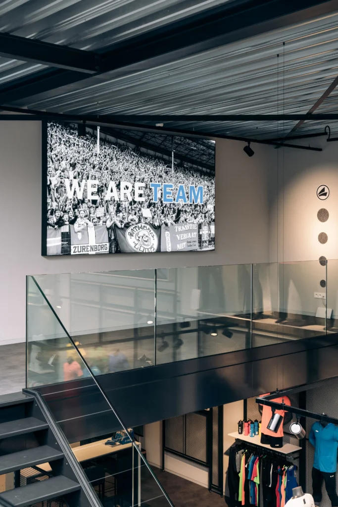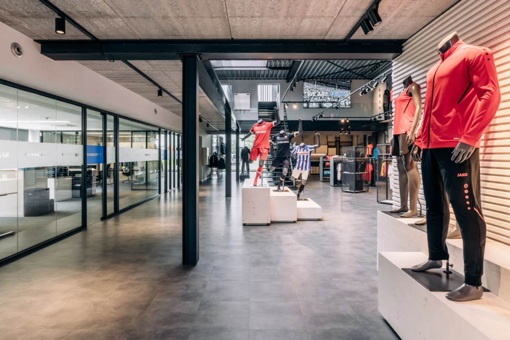 JAKO TEAMSPORT in Lier beschikt over een prachtig gebouw, volledig gerealiseerd dankzij ons totaalontwerp. In dit project hebben we onze P100 COLD scheidingswanden in een elegante zwarte kleur geïntegreerd. Het glas van deze systeemwand werd voorzien van een folie, zorgvuldig afgestemd op de branding. Het resultaat is wederom een aangename en inspirerende werkomgeving.