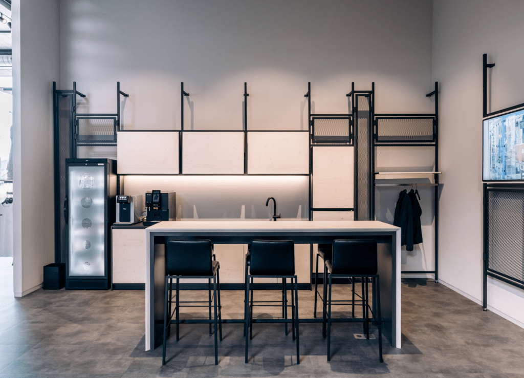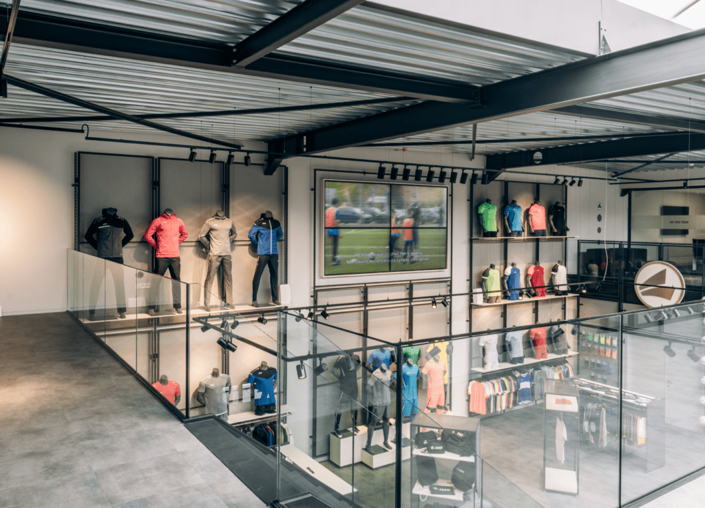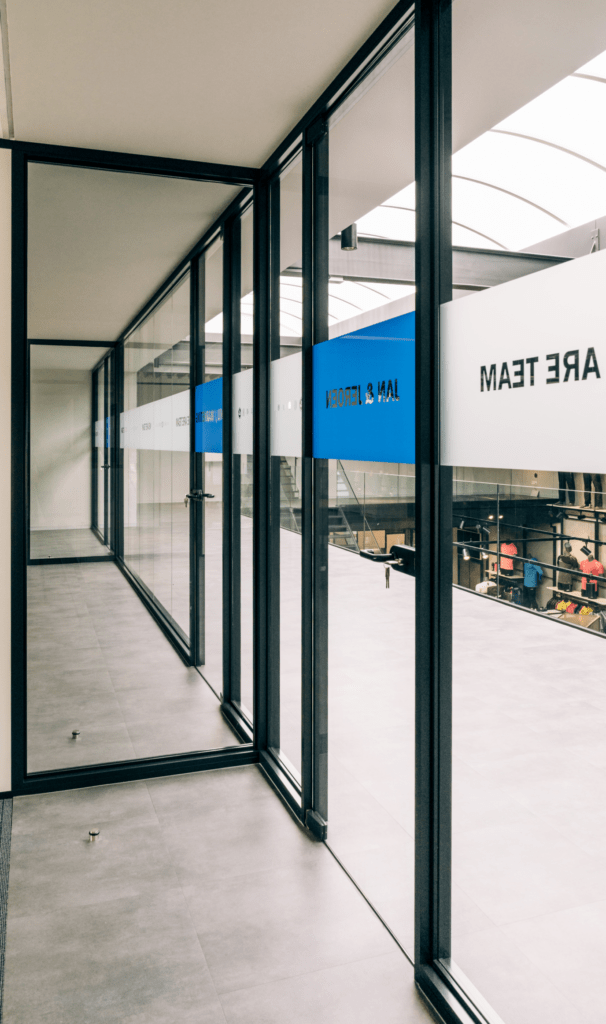 JAKO TEAMSPORT in Lier heeft een prachtig gebouw dankzij ons totaal ontwerp. Hierin verwerkte we onze P100 COLD scheidingswanden in een zwarte kleur. Het glas van deze systeemwand werd bedekt met zandstraalfolie in de juiste branding. En zo werd er alweer aan aangename werkplek gecreëerd.